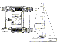 At all times, ELF has fingertight steering, is unusually responsive, yet can steer "hands off" for long periods. Despite its high performance potential, ELF is safe and easy to sail. The high bridgedeck, long cabin and knuckle in the topsides result in a dry boat, even at speed. The furling jib, lazy jacks and fully battened mainsail make even singlehanded sailing easy. The wide overall beam, relatively low rig and buoyant forward sections help increase stability. A 6 hp outboard gives a 6 knot cruising speed and it can be turned to give excellent maneuverability in close quarters. Alternatively 15 hp gives a 10 knot cruising speed, you can tow a waterskier with 35 hp! The low aspect ratio keels are an integral part of the hulls and are the latest in a long line of development. They simplify sailing and beaching enormously, yet windward performance is only a little less than with daggerboards. SPECIFICATIONS: L.O.A. - 8m L.W.L.